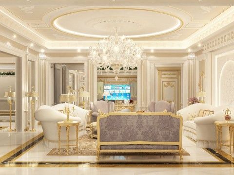 Phòng khách phong cách cổ điển đem đến một không gian lịch thiệp và quý phái. Những bức tranh cổ điển trang trí trên tường và những chiếc đèn chùm lộng lẫy trên trần tạo nên một không gian đầy chất cổ điển. Những bộ sofa bọc nỉ mềm mại và các chiếc bàn trà được chế tác tinh tế mang đến sự sang trọng và đẳng cấp. Những chi tiết chạm khắc và mẫu hoa văn trên các bức tượng và đồ trang trí thêm phần phong cách và đặc biệt. Ánh sáng dịu mờ từ các đèn ngủ và đèn sân khấu tạo nên không gian ấm cúng và lãng mạn. Tất cả các yếu tố này kết hợp tạo nên một phòng khách phong cách cổ điển đẹp mắt và lịch sự, tạo cảm giác như đang sống trong một thời đại hoàng kim.